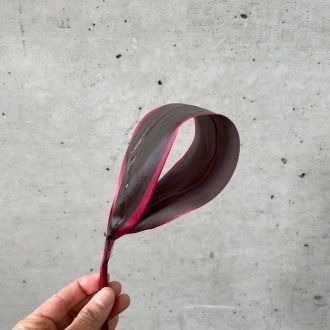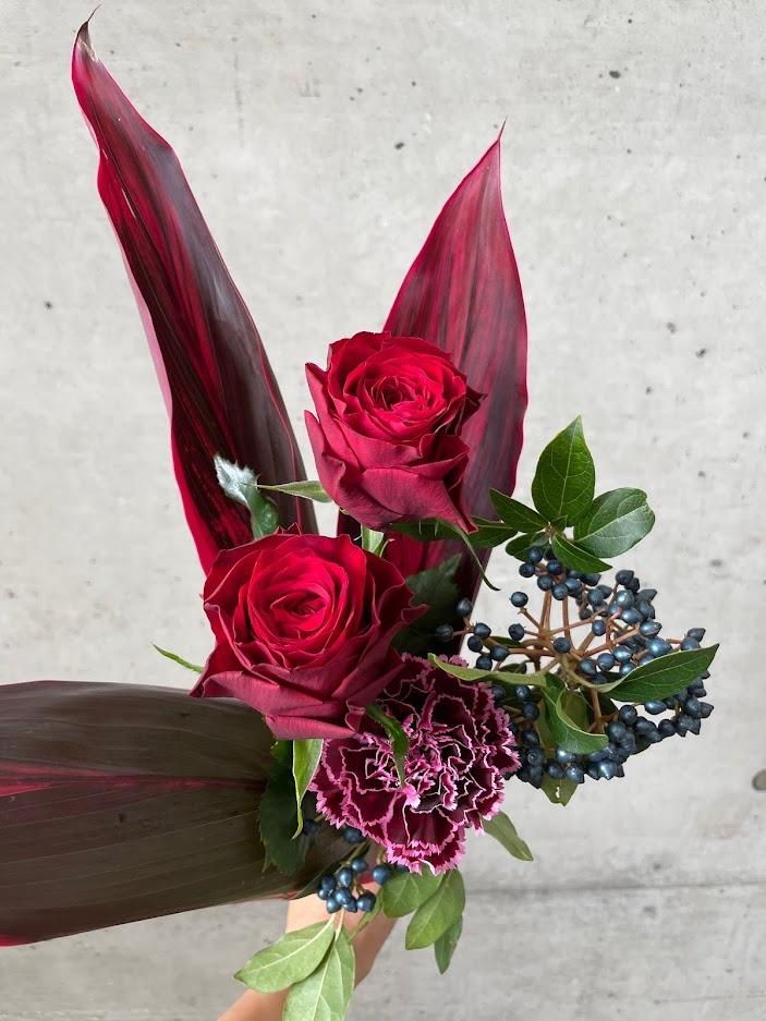 合わせた葉ものも、スタイリッシュに活けていただけるよう、幅広で色味の濃いワイン色のドラセナを選びました。